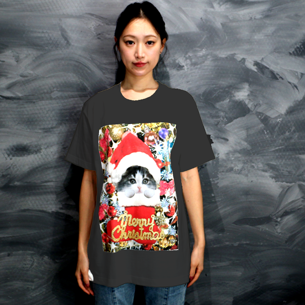 クリスマスにゃんこ カラーデザイン 黒Tシャツ