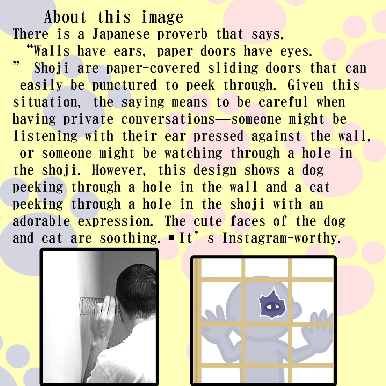 このカラーTシャツは、伝統的な日本の諺をパロディ化したデザインが特徴です。壁に犬、障子に猫という一見シンプルな構図が、実は心温まるストーリーを持っています。デザイナーのこだわりが感じられるこのTシャツは、個性を表現したい方にぴったりのアイテムです。