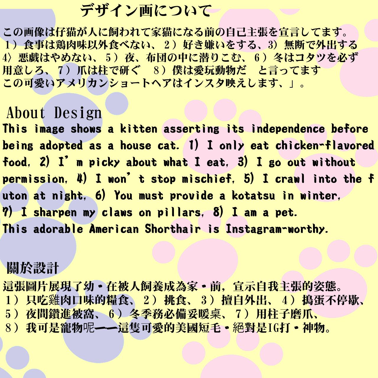 家猫宣言1 カラーTシャツは、仔猫が新しい家族になる前の自己主張を見事に表現した魅力的な一枚です。綿100%で作られたこのTシャツは、男女兼用で、どんなシーンでもお楽しみいただけます。おでかけはもちろん、リラックスしたいお部屋でもシンプルに着こなせるデザインが特徴です。