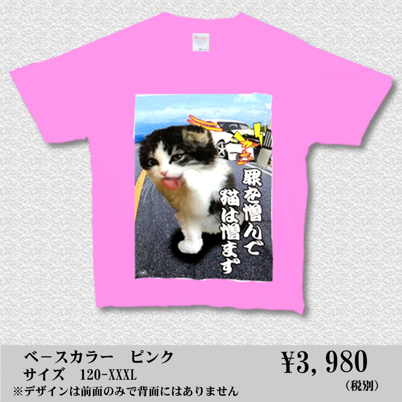 罪を憎んで猫を憎まず カラーデザイン ピンクTシャツ