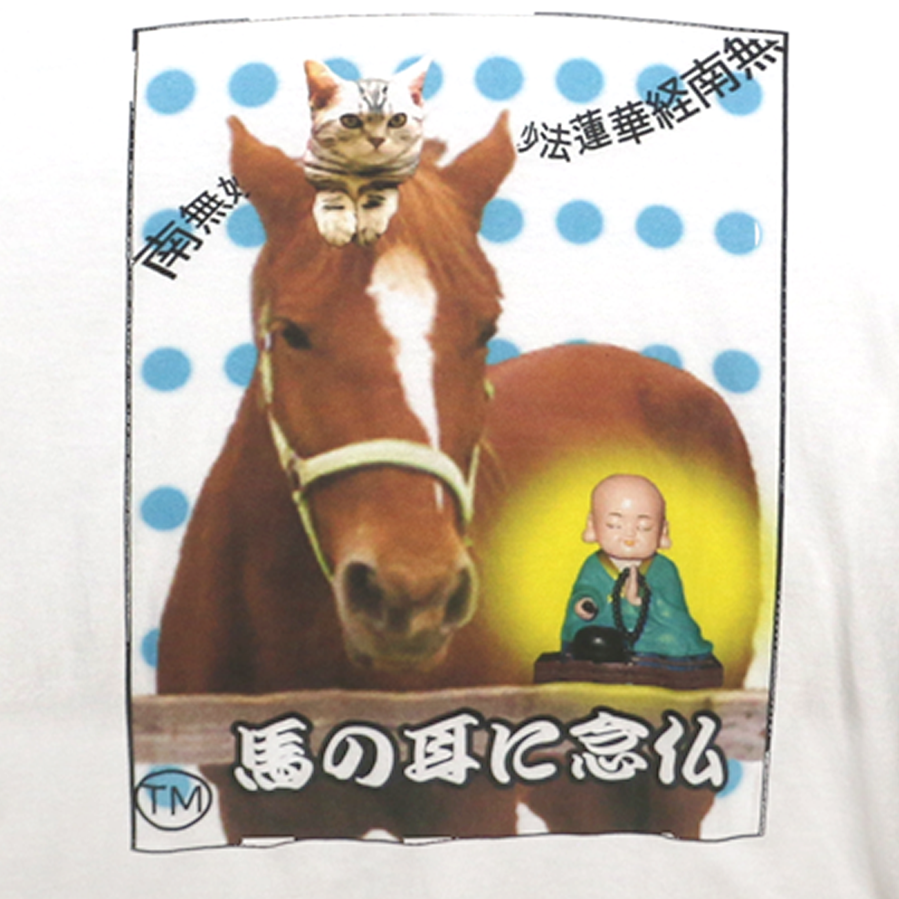 このTシャツのデザインには、言葉の意味をユニークに解釈したストーリーがあります。馬の持つ力強さやお坊さんの静けさ、仔猫の可愛らしさが融合したデザインは、着る人の個性を引き立ててくれるでしょう。