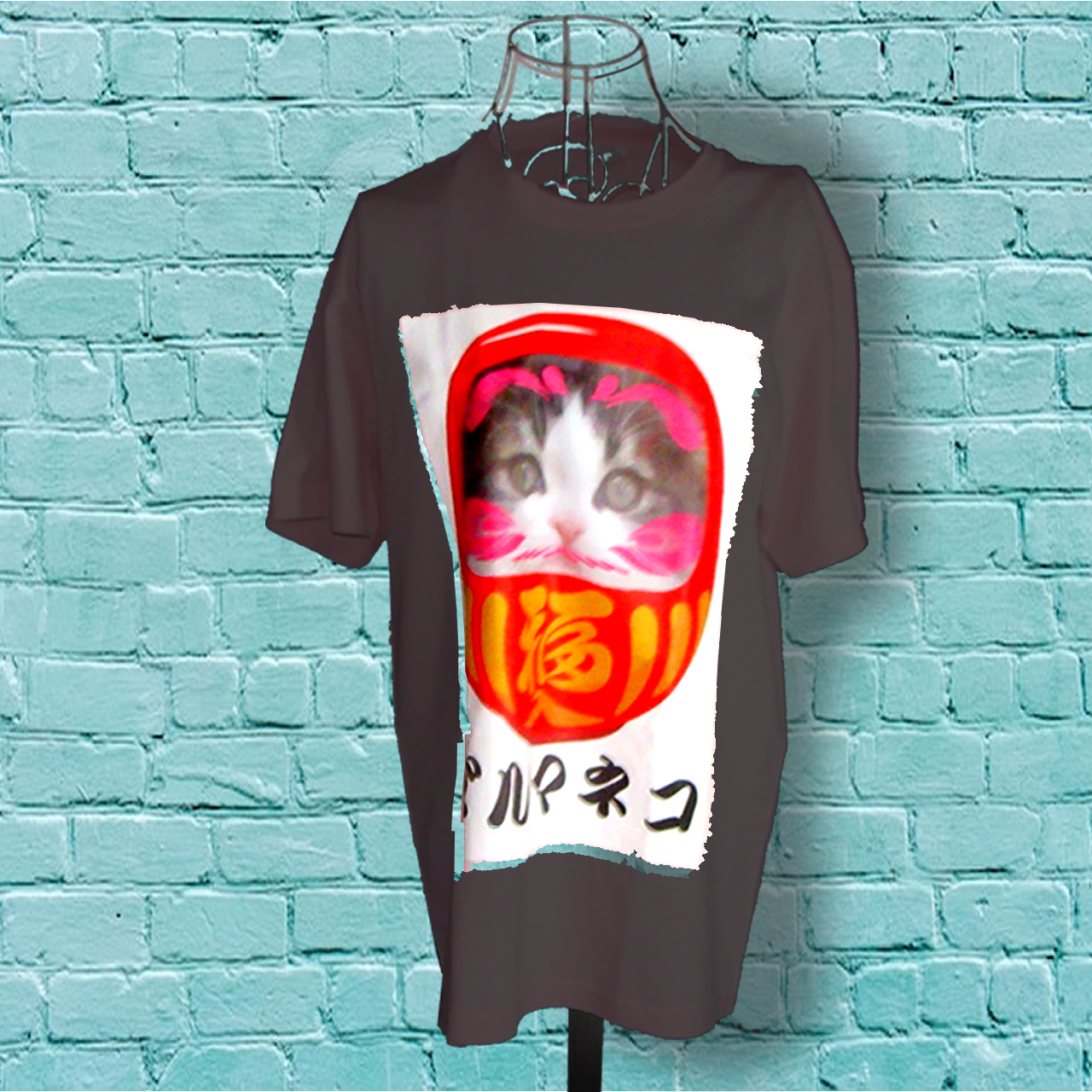 愛らしいスコティッシュフォールドの仔猫が達磨の顔になった「ダルマネコ」白Tシャツ。インスタ映え抜群の一枚で、あなたのファッションにユーモアと愛らしさをプラスしてくれます。