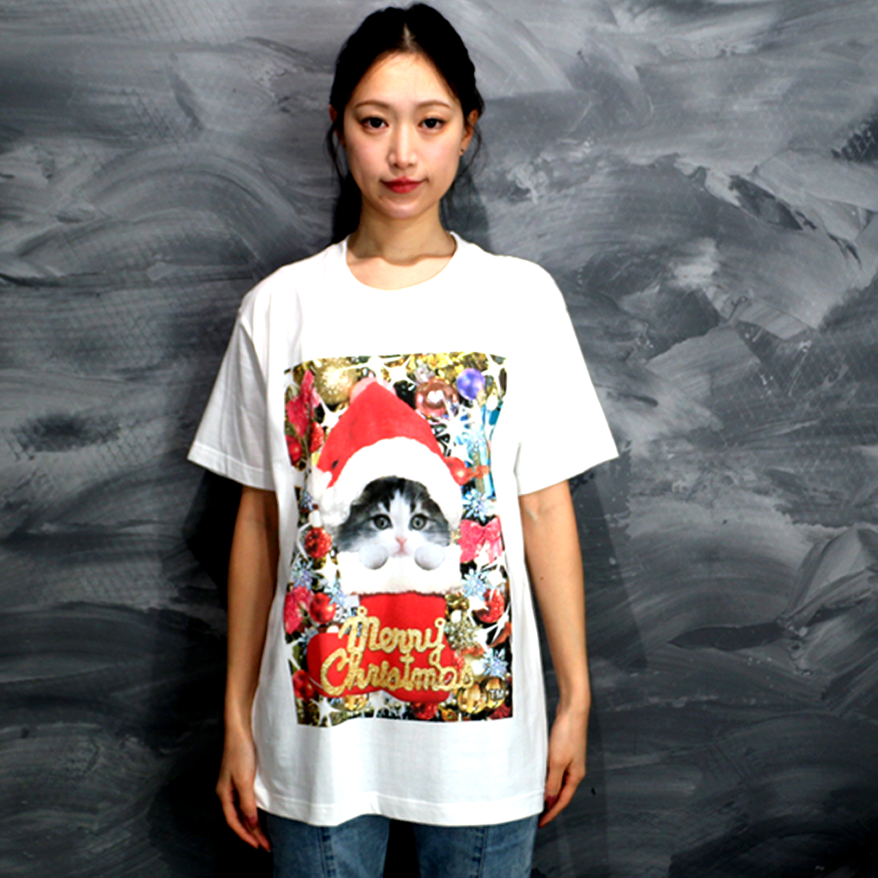 クリスマスにゃんこ カラーデザイン 白Tシャツ